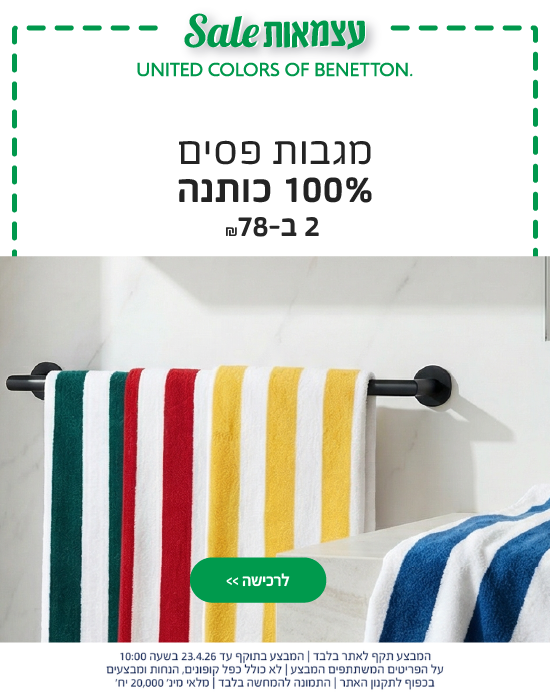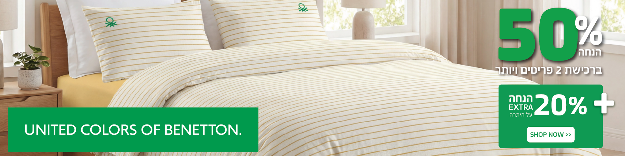 המבצע תקף באתר בלבד | על הפריטים משתתפים במבצע, לא כולל OUTLET וקטגוריית מבצעי עצמאות | 50% הנחה ברכישת 2 פריטים ויותר ממגוון המוצרים באתר | מחיר המוצרים הסופי והנחת אקסטרה מתעדכנים בסל הקניות | לא כולל כפל קופונים, הטבות ומבצעים | בכפוף לתקנון האתר | התמונה להמחשה בלבד | בתוקף עד 20.4.26 בשעה 10:00 | מלאי מיני' 400,000 יחידות