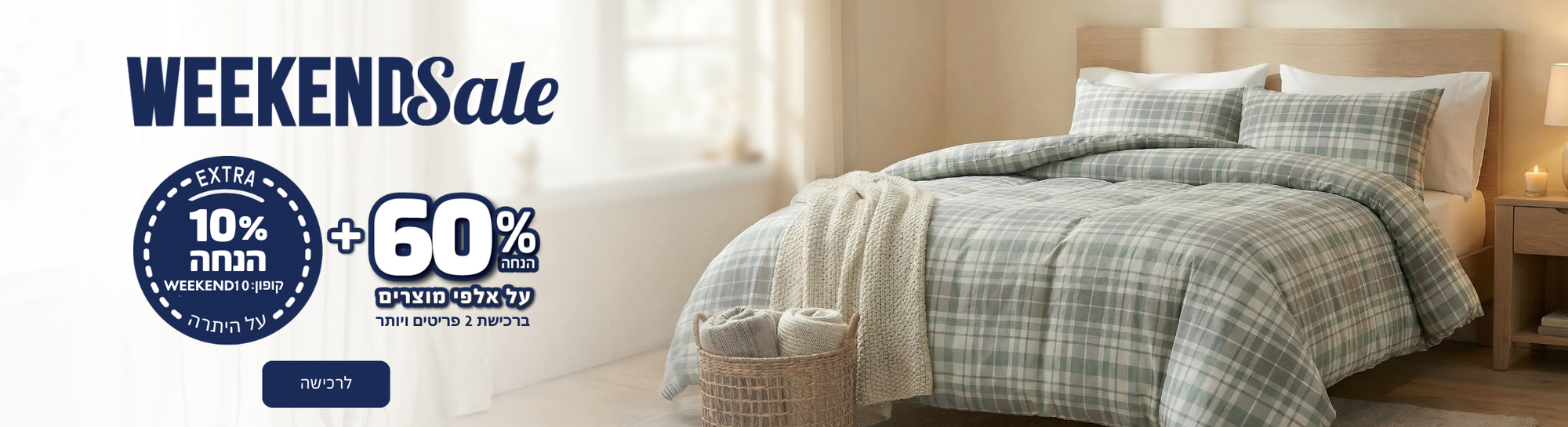 באתר בלבד | על הפריטים המשתתפים במבצע של המותג הום סטייל בלבד | 60% הנחה ברכישת 2 פריטים ויותר ממגוון המוצרים באתר | המחיר מתעדכן בסל הקניות |10% הנחה אקסטרה על היתרה בהקלדת קופון: WEEKEND10 | הנחה אפקטיבית 64% | לא כולל קטגוריית אאוטלט | לא כולל כפל קופונים, הטבות ומבצעים | בכפוף לתקנון האתר | התמונה להמחשה בלבד | בתוקף עד 18.1.26 | מלאי מינימלי 400,000 יח'