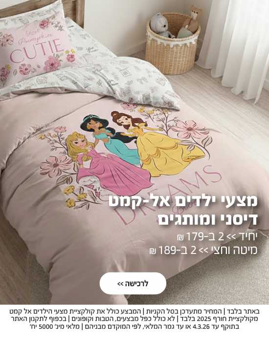 באתר בלבד | על הפריטים המשתתפים במבצע | 50% הנחה ברכישת 2 פריטים ויותר ממגוון המוצרים באתר | 15% הנחה אקסטרה על היתרה | המחיר והנחת האקסטרה מתעדכים בסל הקניות | לא כולל קטגוריית OUTLET | לא כולל כפל קופונים, הטבות ומבצעים | בכפוף לתקנון האתר | התמונה להמחשה בלבד | בתוקף עד 3.3.26 | מלאי מינימלי 400,000 יח'